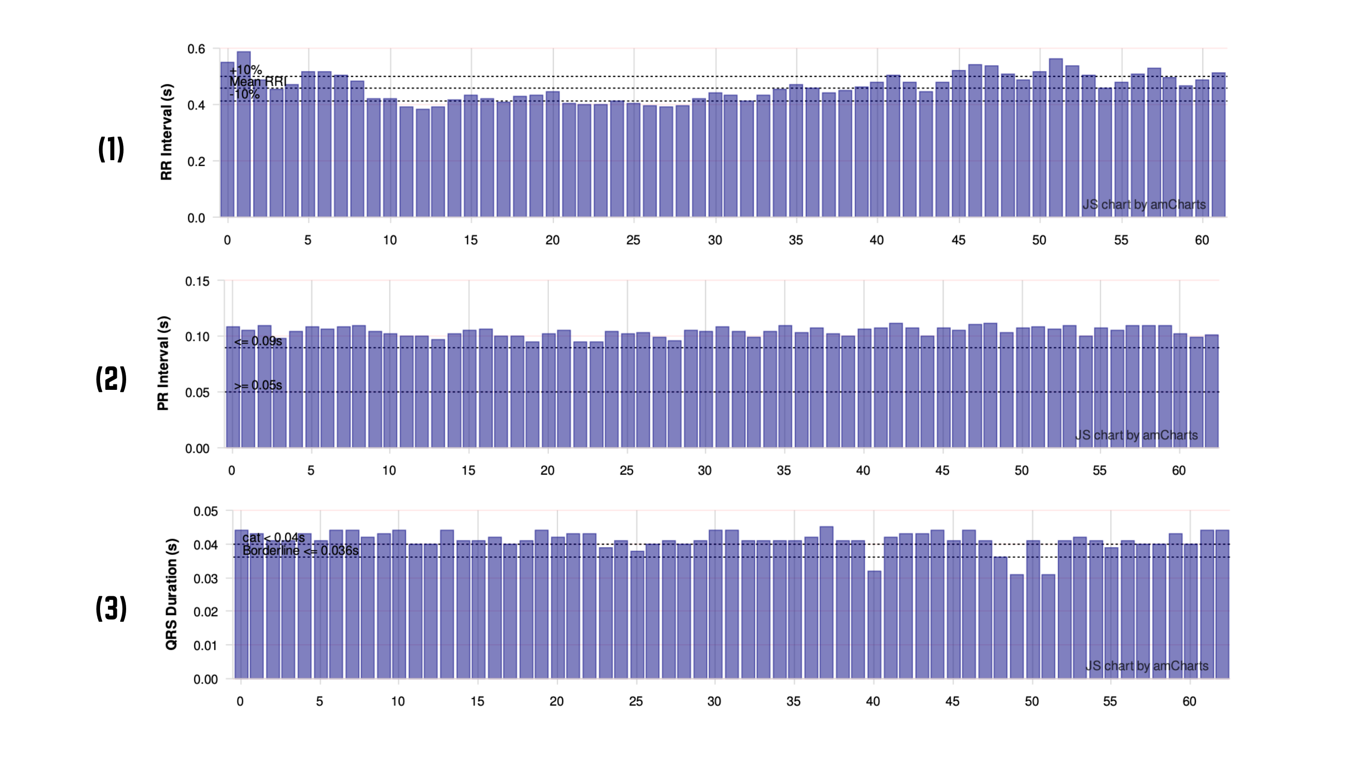 Figure 2. CardioBird interval charts. The RR‑interval plot, and PR/QRS duration charts demonstrate: (1) beat‑to‑beat RR variability; and (2) a shift of PR and (3) QRS values above reference limits in a significant proportion of beats.